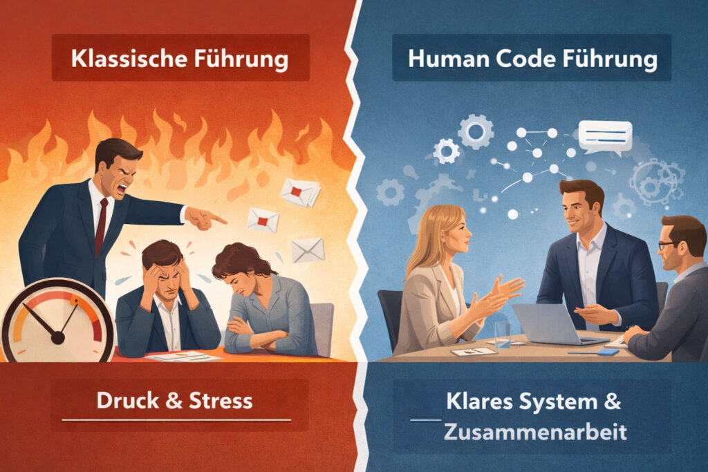 Der Unterschied zwischen beiden Ansätzen ist fundamental: Während klassische Führung versucht, Verhalten durch Druck zu steuern, betrachtet der Human Code Leistung als Ergebnis eines funktionierenden Systems aus Stressregulation, klaren Erwartungen und kontinuierlichem Feedback.